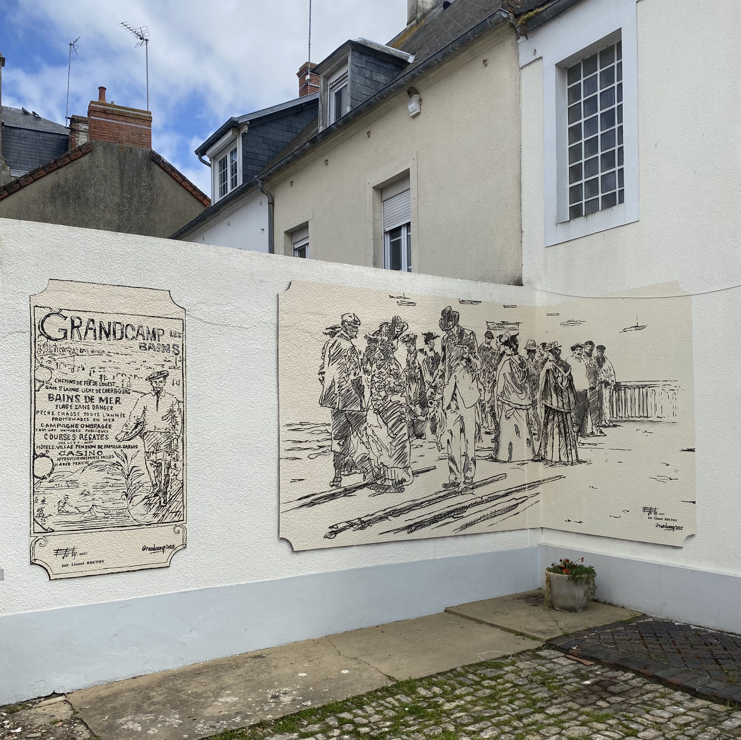 Dans le cadre d’une commande de la commune de Grandcamp, la ville souhaitait habiller quatre murs dans la rue principale du centre en reproduisant à l’identique des œuvres de l’artiste local Éric Joly. En collaboration étroite avec lui, nous avons reproduit ses œuvres en y apportant également notre propre sensibilité. Des œuvres inspirées de la vie de Grandcamp à la grande époque du début du XXᵉ siècle.